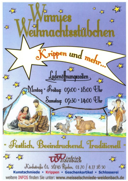 Unsere AusstellungenAktuelles:Fröhliche Weihnachten überall!UNSERE PRÄSENTATION ZUR ADVENTS- und WEIHNACHTSZEIT! Zum 13. Mal präsentieren wir: WINNIE`S WEIHNACHTSSTÜBCHEN ... KRIPPEN und mehr ...! Ab dem 30.11.2025! Auf 60 qm Ausstellungsfläche präsentieren wir Ihnen festliche und dekorative Artikel für das ganze Jahr über sowie für die Weihnachts- und Osterzeit. |